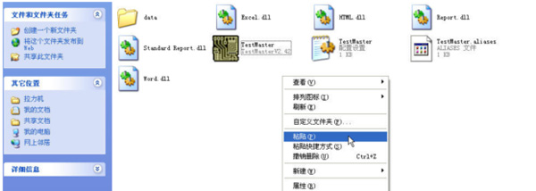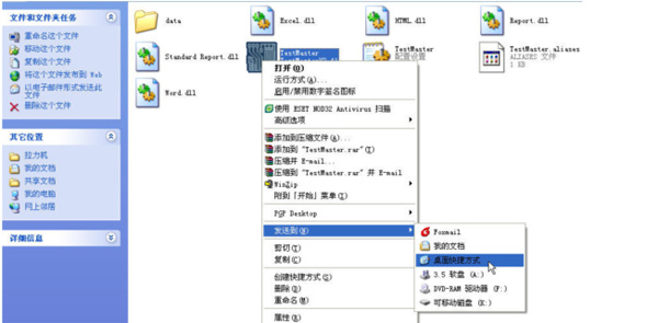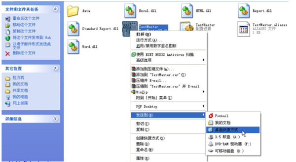 5.刪除桌面上的快捷方式”TestMater”,然后為新版本軟件制作一個新的快捷方式:鼠標(biāo)右鍵單擊新版本軟件所在文件夾中的”TestMaster”程序,再鼠標(biāo)左鍵單擊下圖所示的”桌面快捷方式”選項,桌面上就會有了一個新版本軟件的快捷方式:
