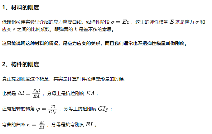 這里剛度都是用模量(彈性模量,剪切模量)乘以截面參數(面積,極慣性矩,慣性矩)因為構件(桿、軸、梁)變形時產生的位移都和這個剛度值成反比。實際我們在討論結構變形時,關心的也通常是構件產生的位移,而非應變。所以只知道彈性模量,不知道截面參數也是不行的。