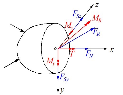 把主矩向三個坐標軸分解可得三個分量:沿著x軸的扭矩,沿著y軸和z軸的彎矩。